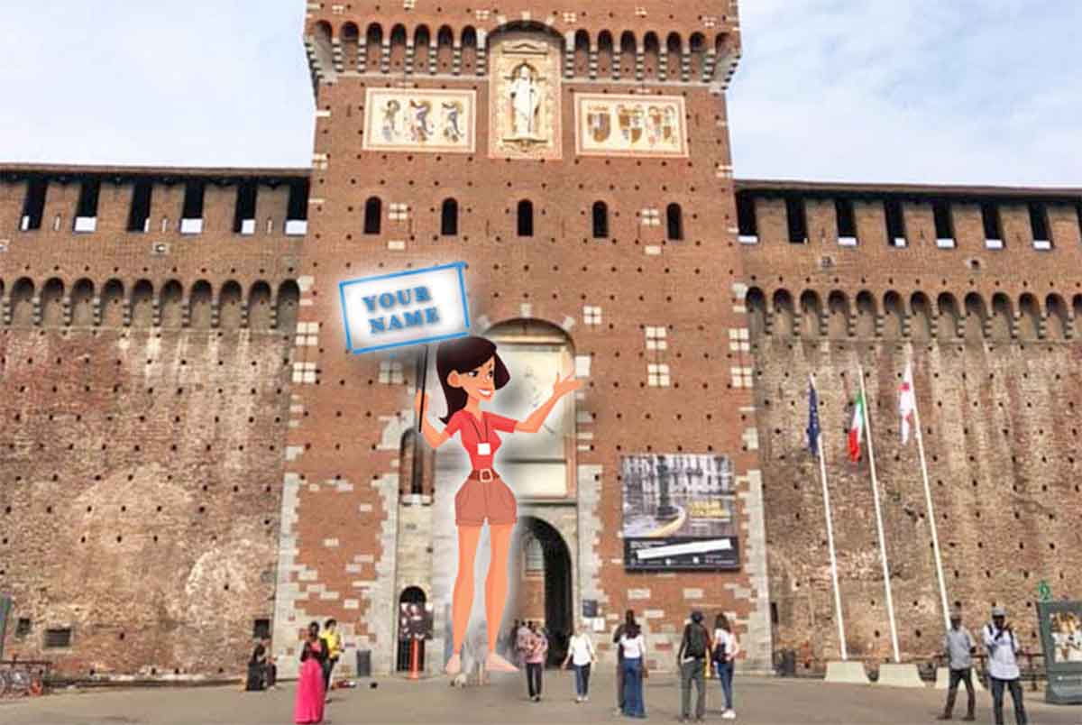 You will meet you guide at the door under the main tower of the Sforza Castle (there are fountains in front). She/he will have a sign with your name.